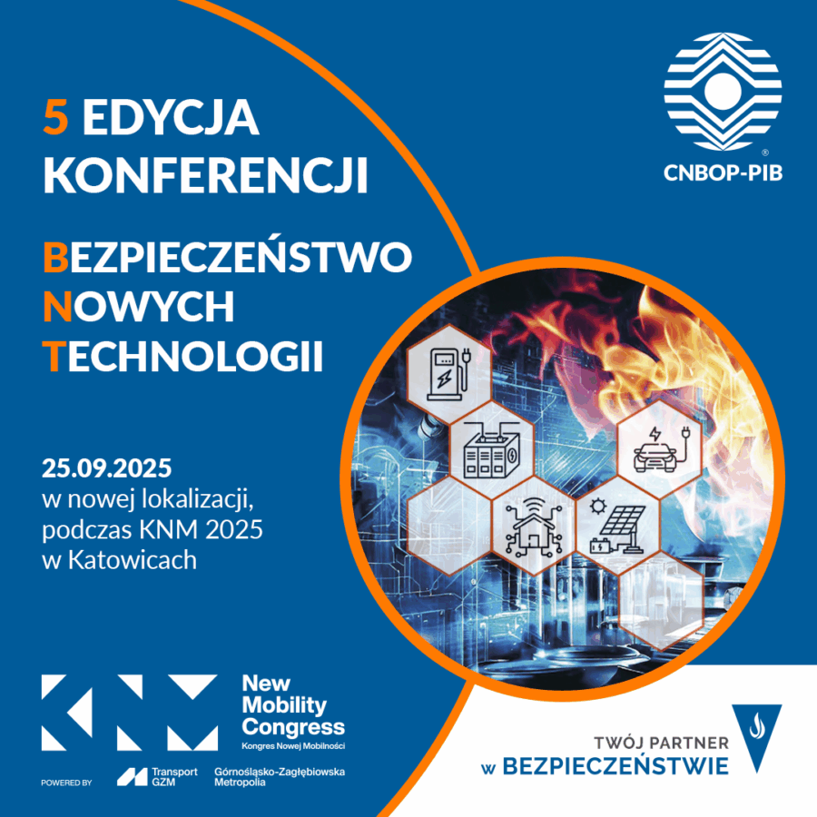 Centrum Naukowo-Badawcze Ochrony Przeciwpożarowej wraz ze współorganizatorami zaprasza do udziału w V międzynarodowej konferencji naukowej Bezpieczeństwo Nowych Technologii, która odbędzie się w dniu 25.09.2025 roku w nowej lokalizacji w ramach Kongresu Nowej Mobilności w Międzynarodowym Centrum Kongresowym w Katowicach.